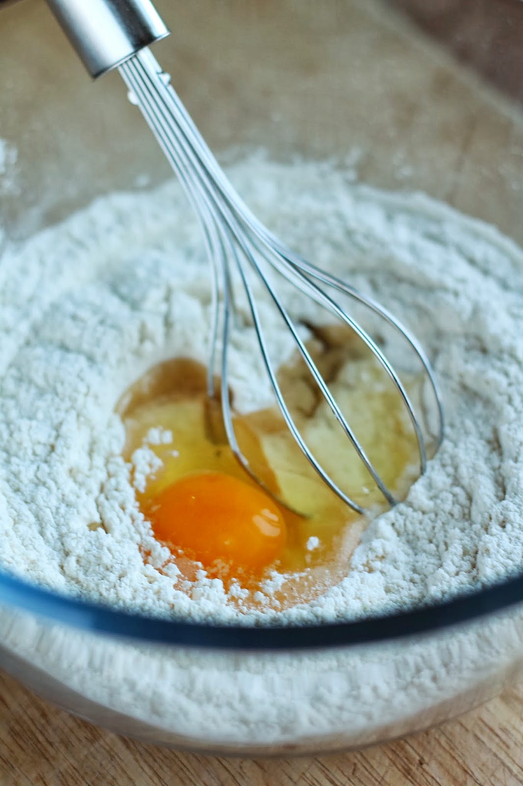 Make a well in the center of the flour, add the egg and the vegetable oil. Whisk the egg and oil into the flour until it is just combined.