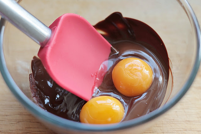 Carefully separate eggs. Stir egg yolks into the melted chocolate, until smooth and slightly thickened. Set aside.