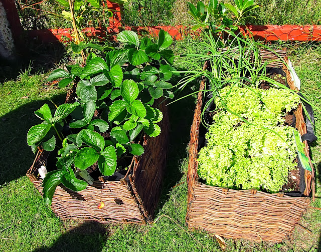 To be perfectly honest, I didn't really hold out much hope, I mean this is me, I kill stuff at an alarming rate! The top bed has six strawberry plants and the bottom planter has nine of each Lollo Rossa Lettuce plants and spring onions. They look so small, will they survive?