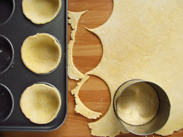 Cut out with a round cutter. I use a 8½cm cutter for my tin, but you might need a different size, it depends on the depth of your tray.
