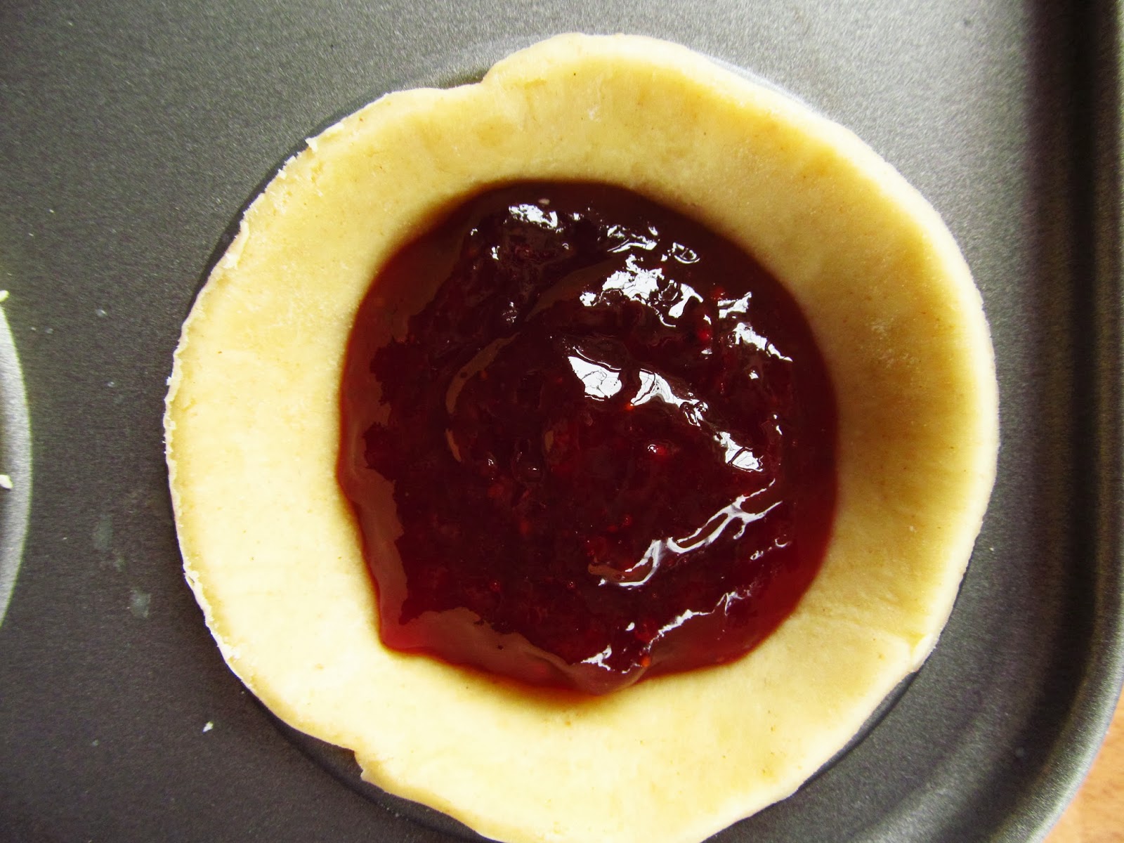 Place roughly a teaspoon and a half of jam into each pastry tart.