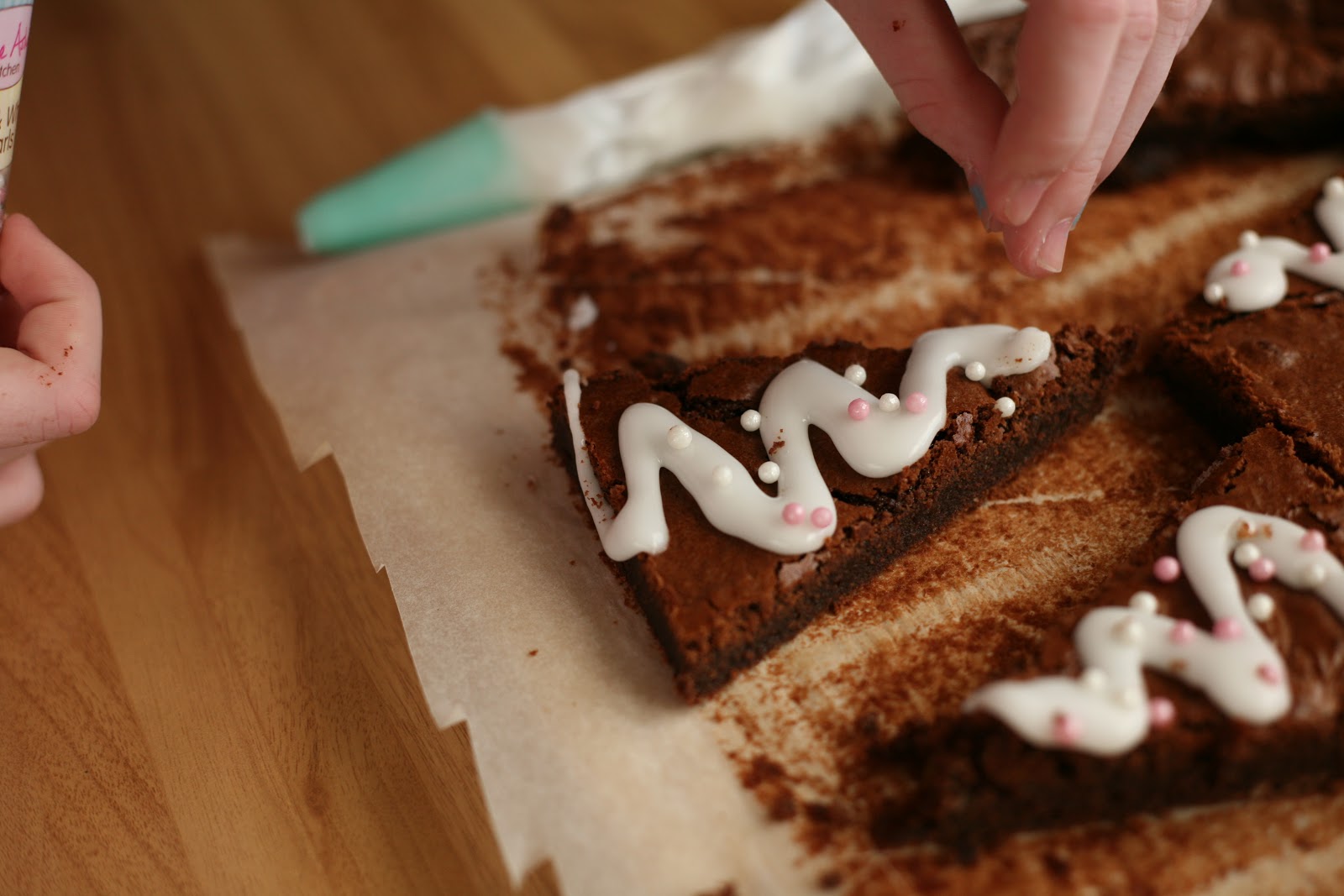 Fit the piping bag with the round nozzle and fill with the icing. Pipe a zig zag line from top to bottom on each brownie.