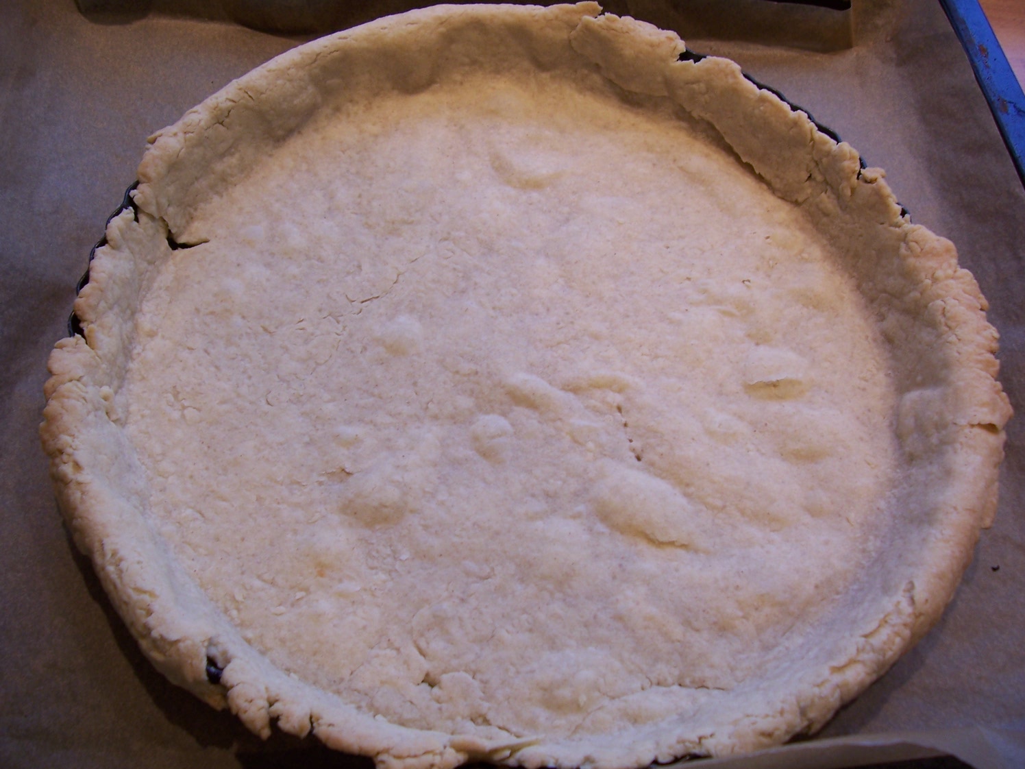 Place on a baking tray and bake blind for 20 minutes. Remove the beans and parchment and return to the oven for another five minutes to cook the base.