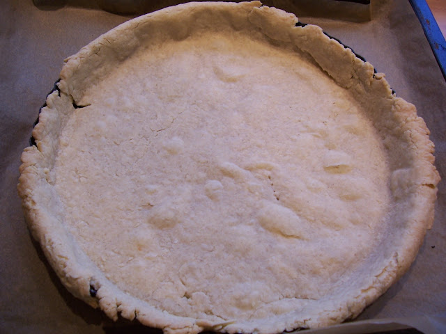 Preheat the oven to 190C/375F/Gas 5. Remove the pastry case from the fridge and line the base of the pastry with baking parchment and then fill it with baking beans (I used uncooked rice which I pushed right to the edges of the flan tin, otherwise it will bubble up, I know this firsthand because this photograph was my second attempt!).