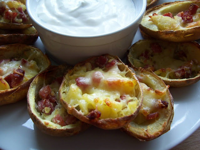 Preheat the oven to 200C and line a large baking tray with parchment paper or greaseproof paper. Lay the potato skins about 3-4cm apart and fill with the ham or bacon and top with the grated cheese. (Often I have leftover potato which I mix with the ham and top as usual with the cheese, it is a much more substantial meal this way.)