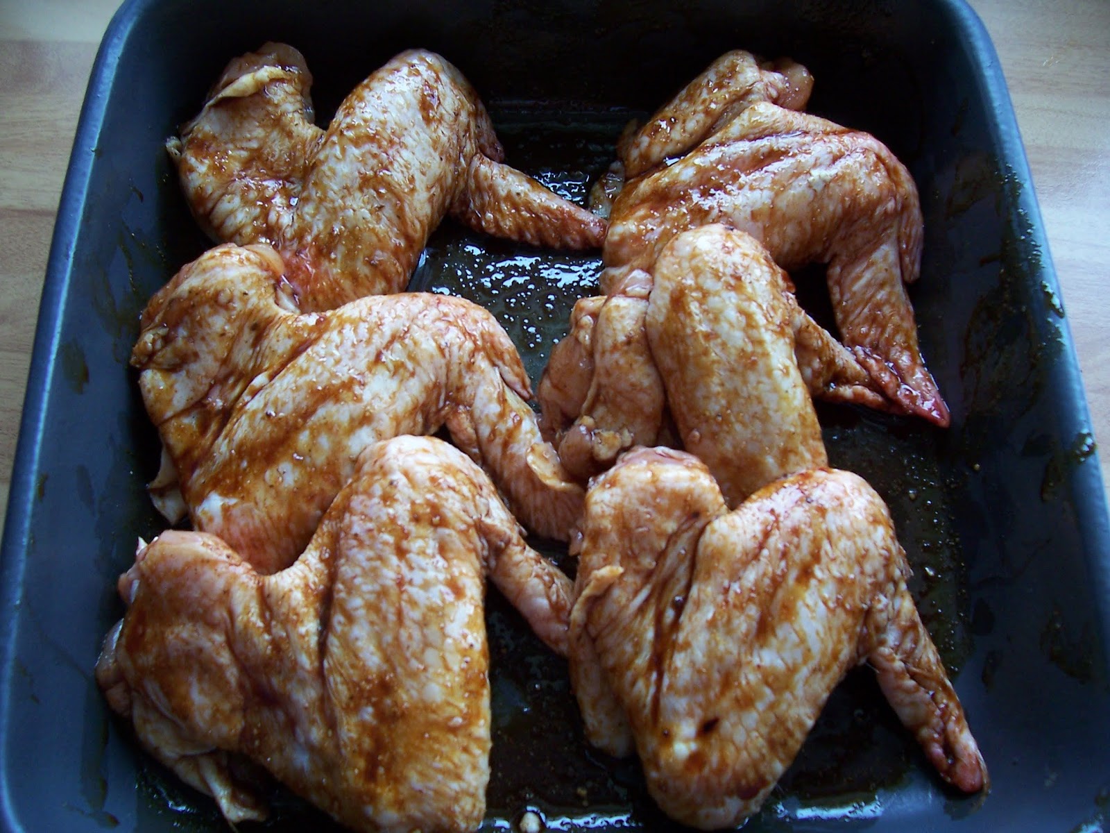 Preheat the oven to 200C, place the chicken wings into a large ovenproof dish. Mix the sauce ingredients together in a small bowl, pour the sauce over the wings and either brush the sauce all over the wings or get your hands in there and rub in the sauce thoroughly.