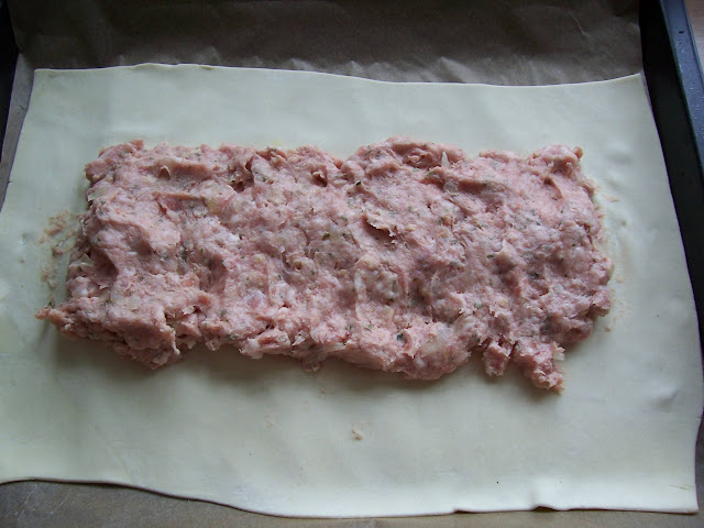Lay the pastry onto the prepared baking tray. Place the sausage filling into the centre of the pastry, leave a 5cm border all the way round.