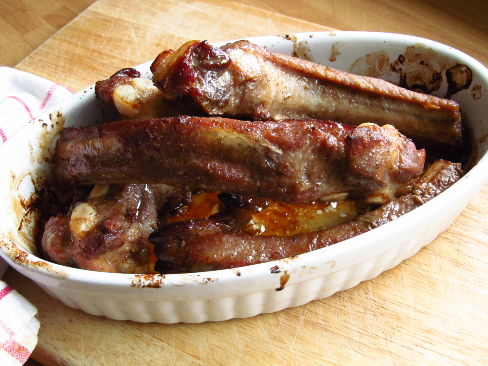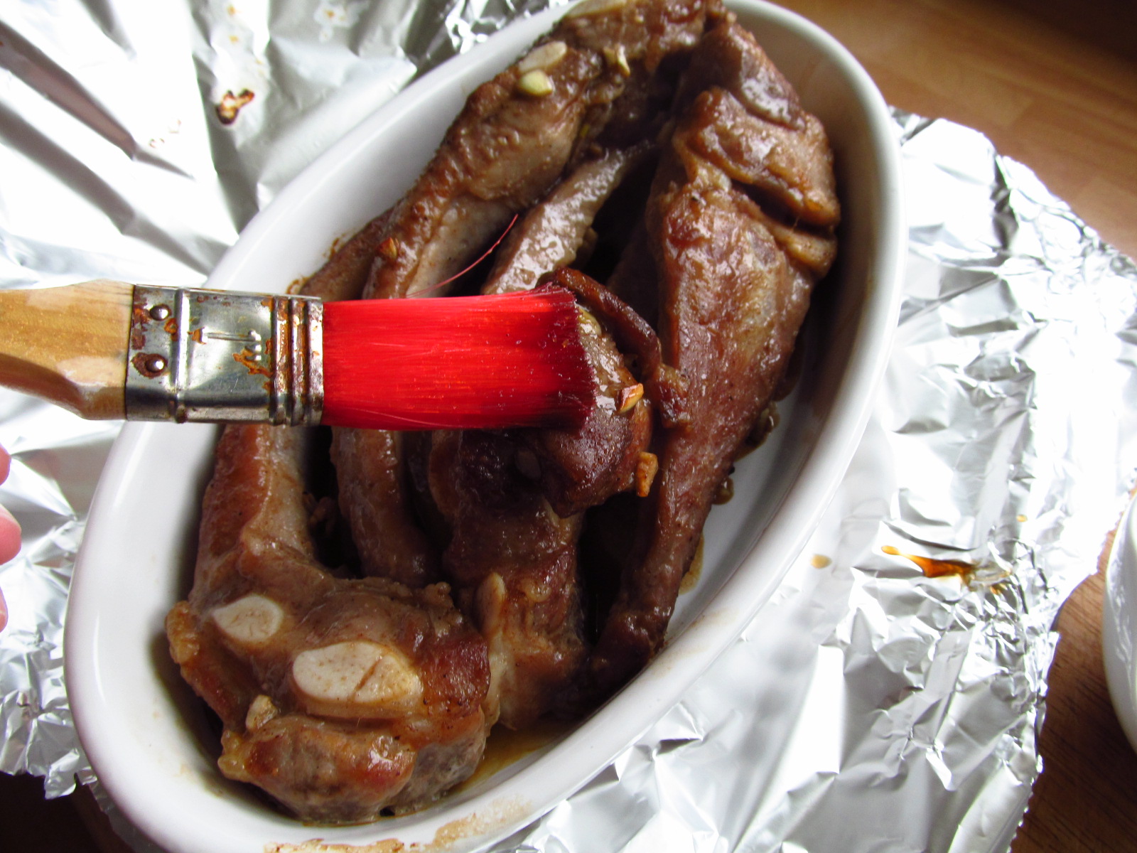 Drain the ribs, reserving the marinade, cover with foil and cook in preheated oven, at 180C/ 350F/Gas Mark 4 for 1 hour.