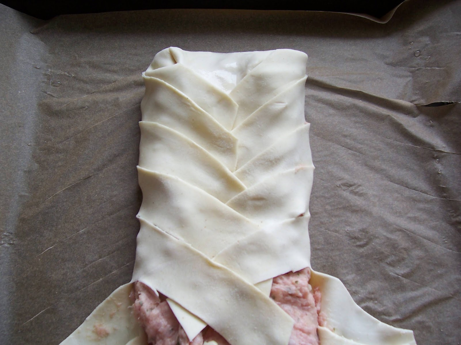 Down each side of the boarder, cut strips every 2½ cms from the filling to the edge at 45º angle. I like to flour the knife first to prevent it from sticking to the pastry. Start with folding the very top of the pastry towards yourself onto the sausage filling, then plait the pastry strips alternately left to right, left to right, across the sausage mixture.