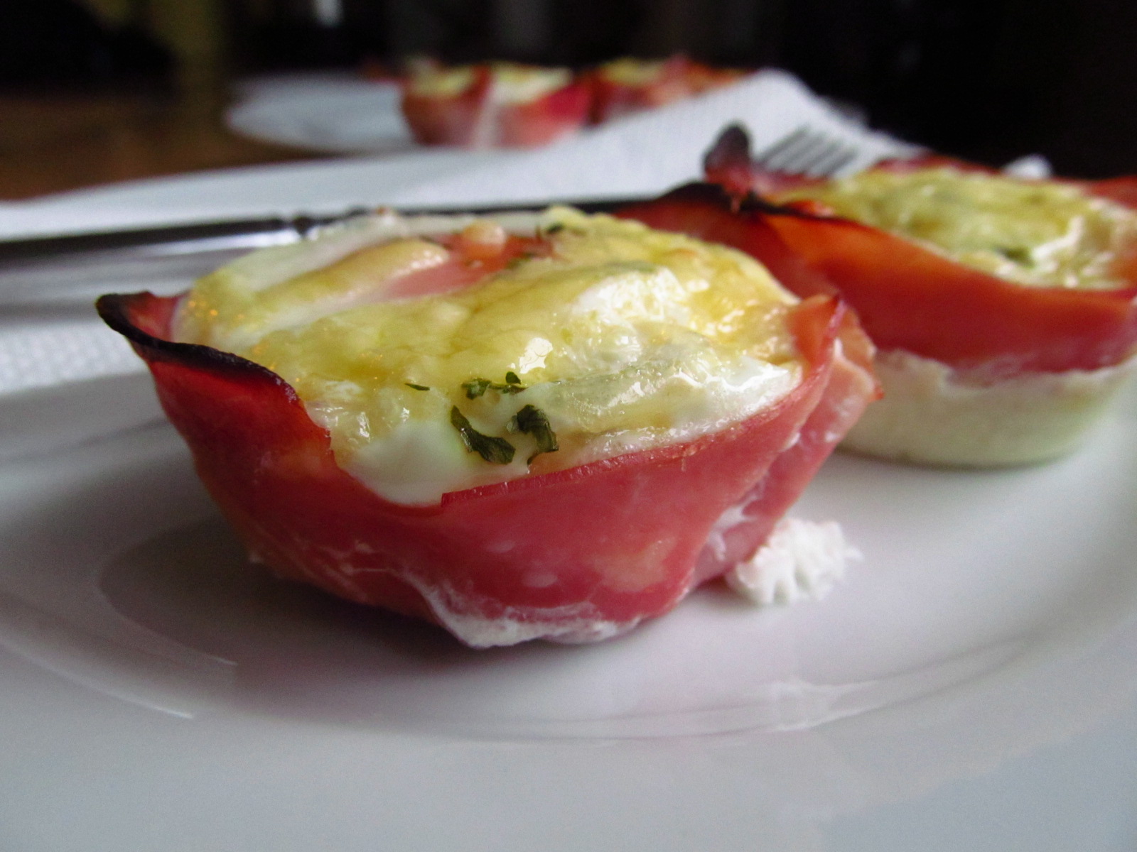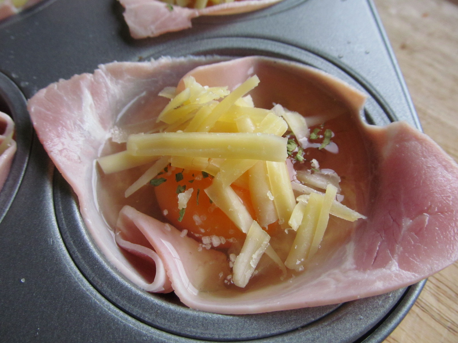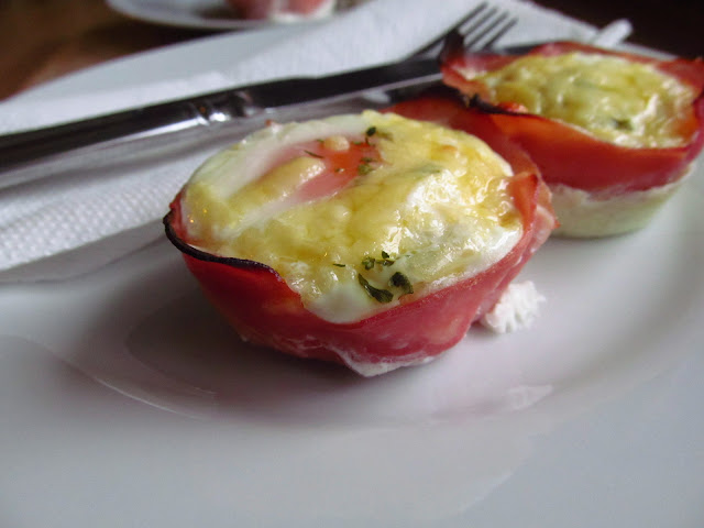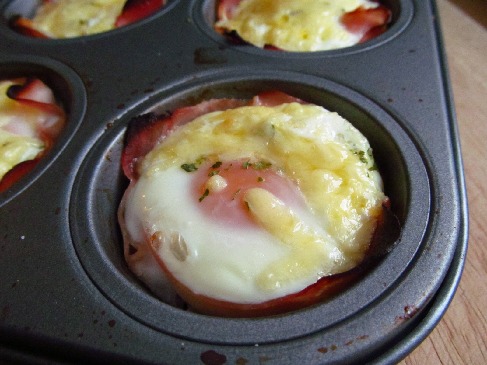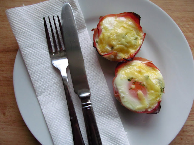 Preheat the oven to 180ºC/350ºF/Gas Mark 4. Grease or oil eight holes of a muffin tray, place a slice of ham in each of the holes. Gently ease the ham into the base of the muffin tray, crack an egg into each of the ham pockets.