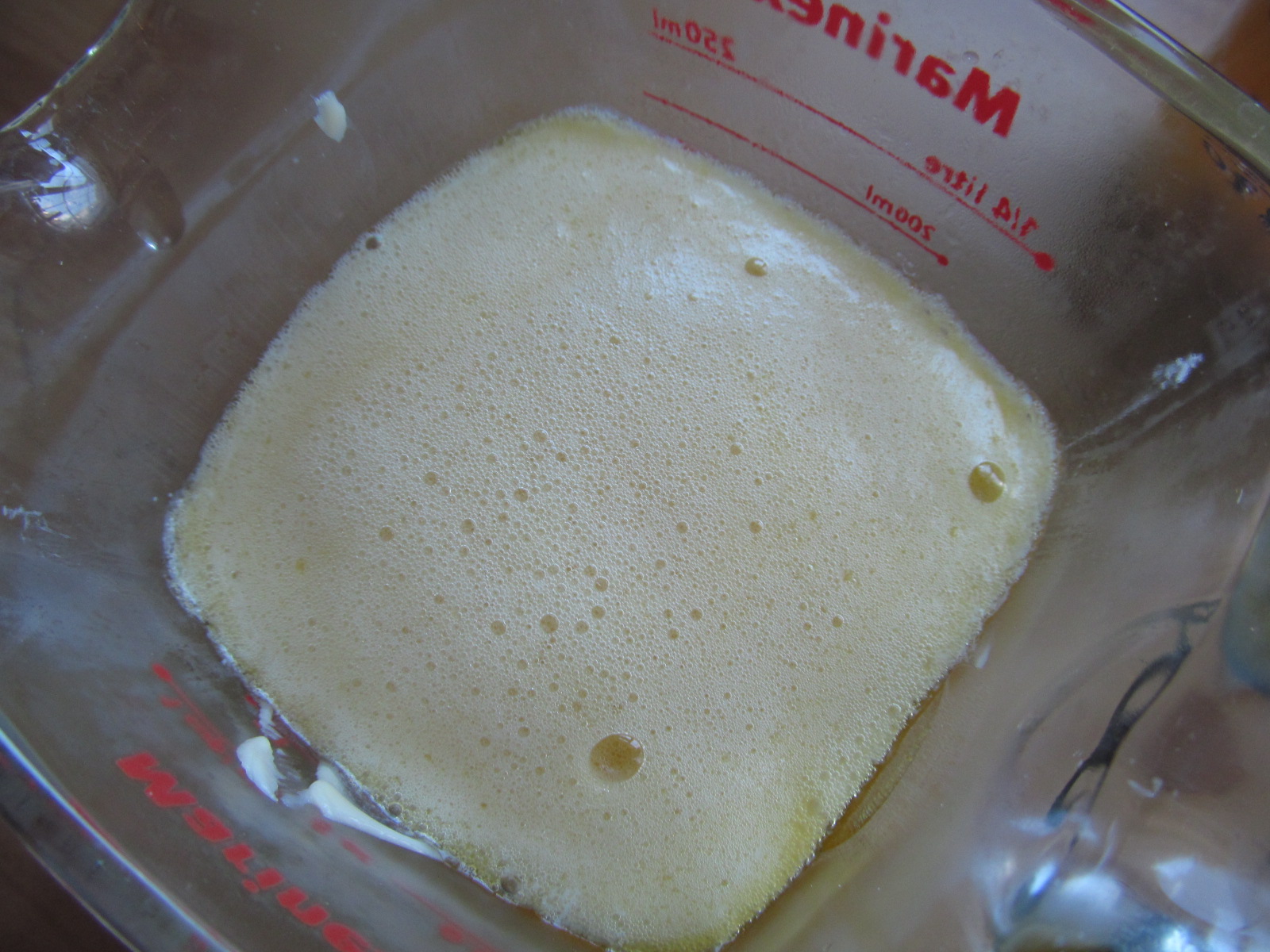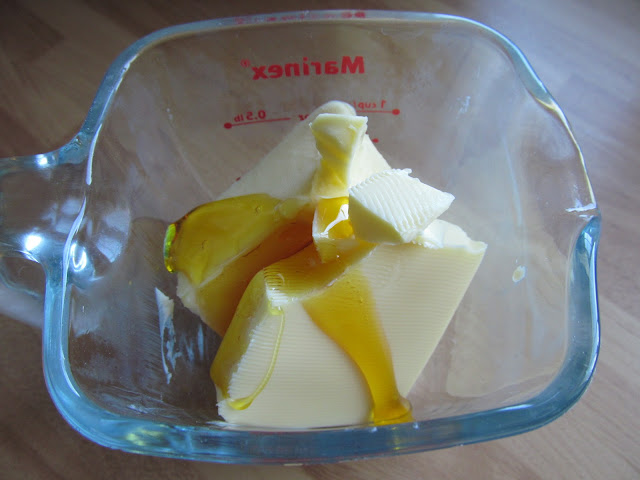 Melt the butter and golden syrup together in a small jug in the microwave or over a low heat in a saucepan. Meanwhile mix the bicarbonate of soda and boiling water together until it starts to fizz. Pour the bicarbonate of soda mixture into the melted butter.