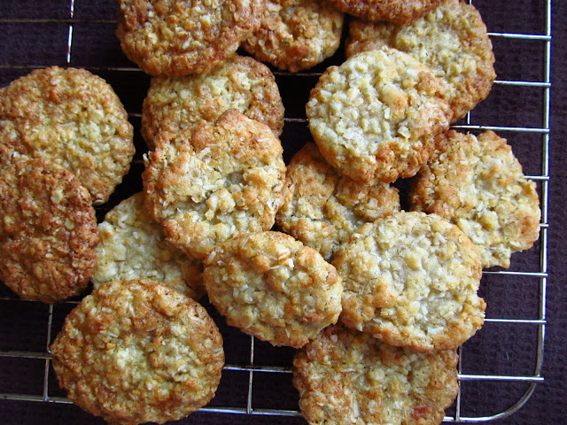Last week, I was reading a soppy romance novel which was situated in Australia, the heroine was baking these biscuits (all of course while making doe eyes at her hero!!). I was hooked, on the biscuits that is, (perhaps I missed the whole point of the book!). In the book there was talk of cinnamon, but I wanted an original recipe so I Googled ANZAC biscuits and was very pleasantly surprised by this simple and tasty recipe. These ANZAC (Australian New Zealand Army Corps) biscuits are an eggless, sweet chewy biscuit, perfect for lunch boxes and seducing tall dark heroes in romance novels!