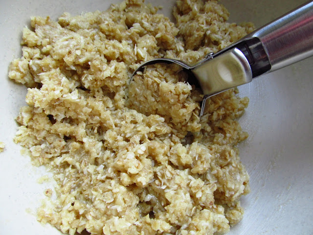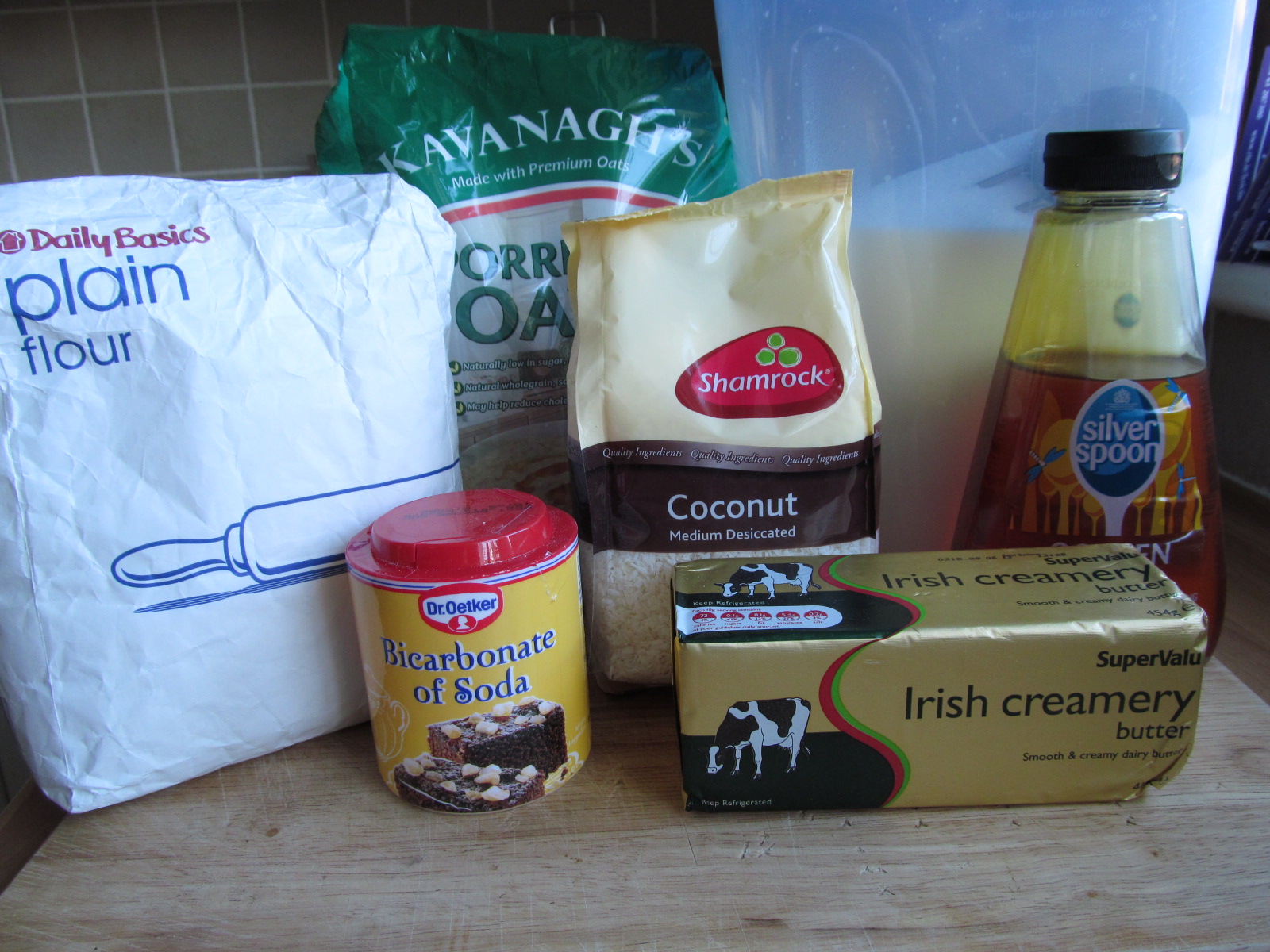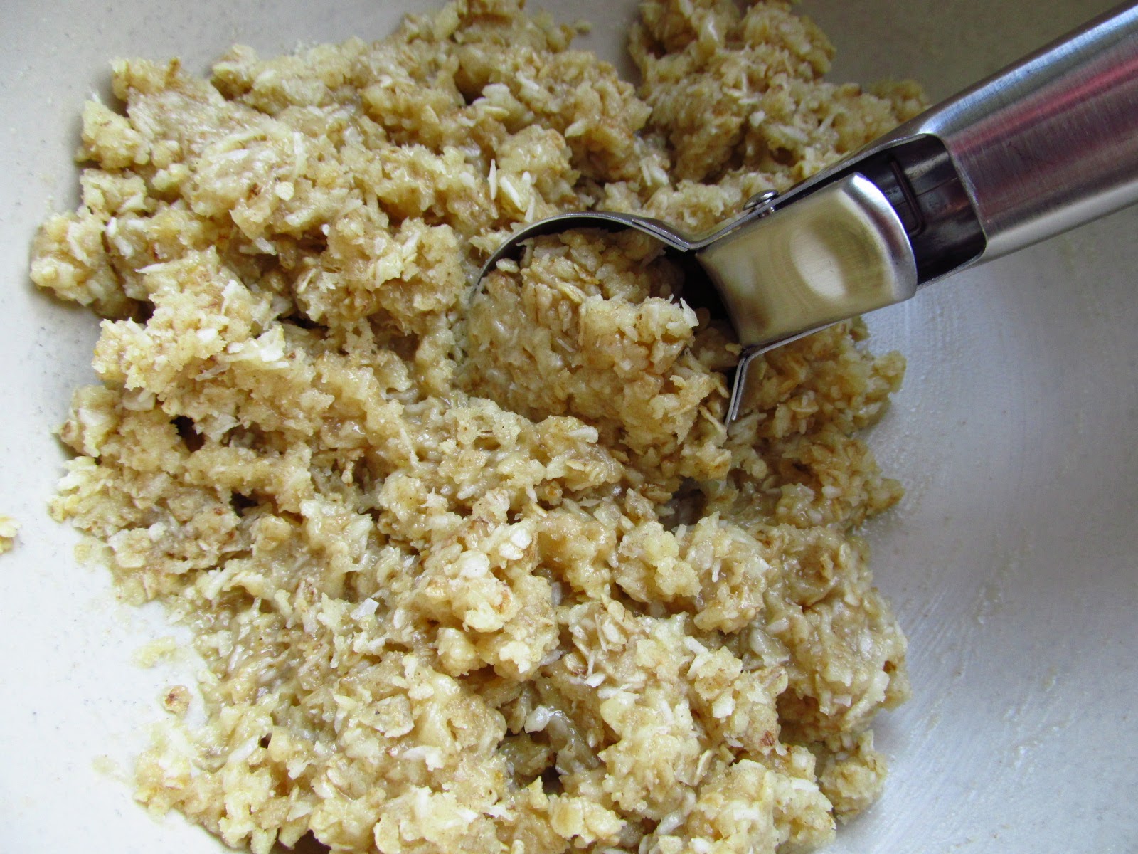 Preheat the oven to 180ºC/350ºF/Gas Mark 4, line two large baking sheets with baking paper. Combine the porridge, flour, coconut and sugar in a large bowl.