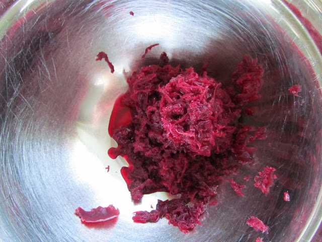 In a small bowl, finely grate the beetroot. Add the eggs, one at a time, then add the vanilla and oil and blend until smooth.