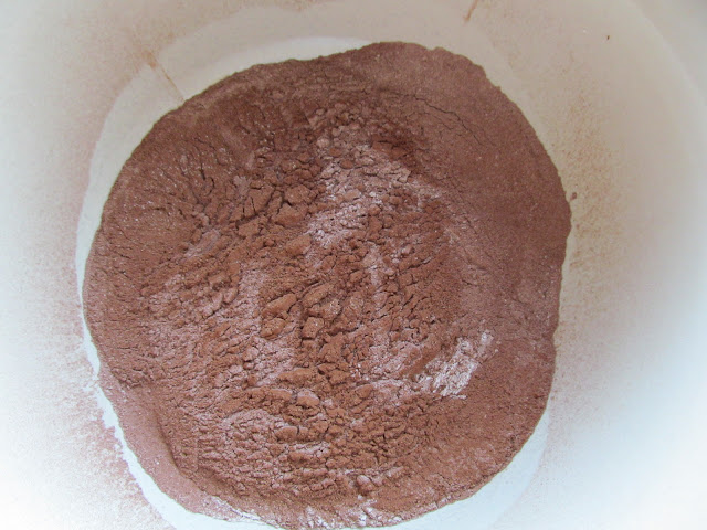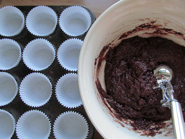 Preheat the oven to 180C/355F/Gas 4. Arrange paper muffin cases in a 12-mould muffin tin. Sift the cocoa powder, flour and baking powder into a bowl. Mix in the sugar, and set aside.