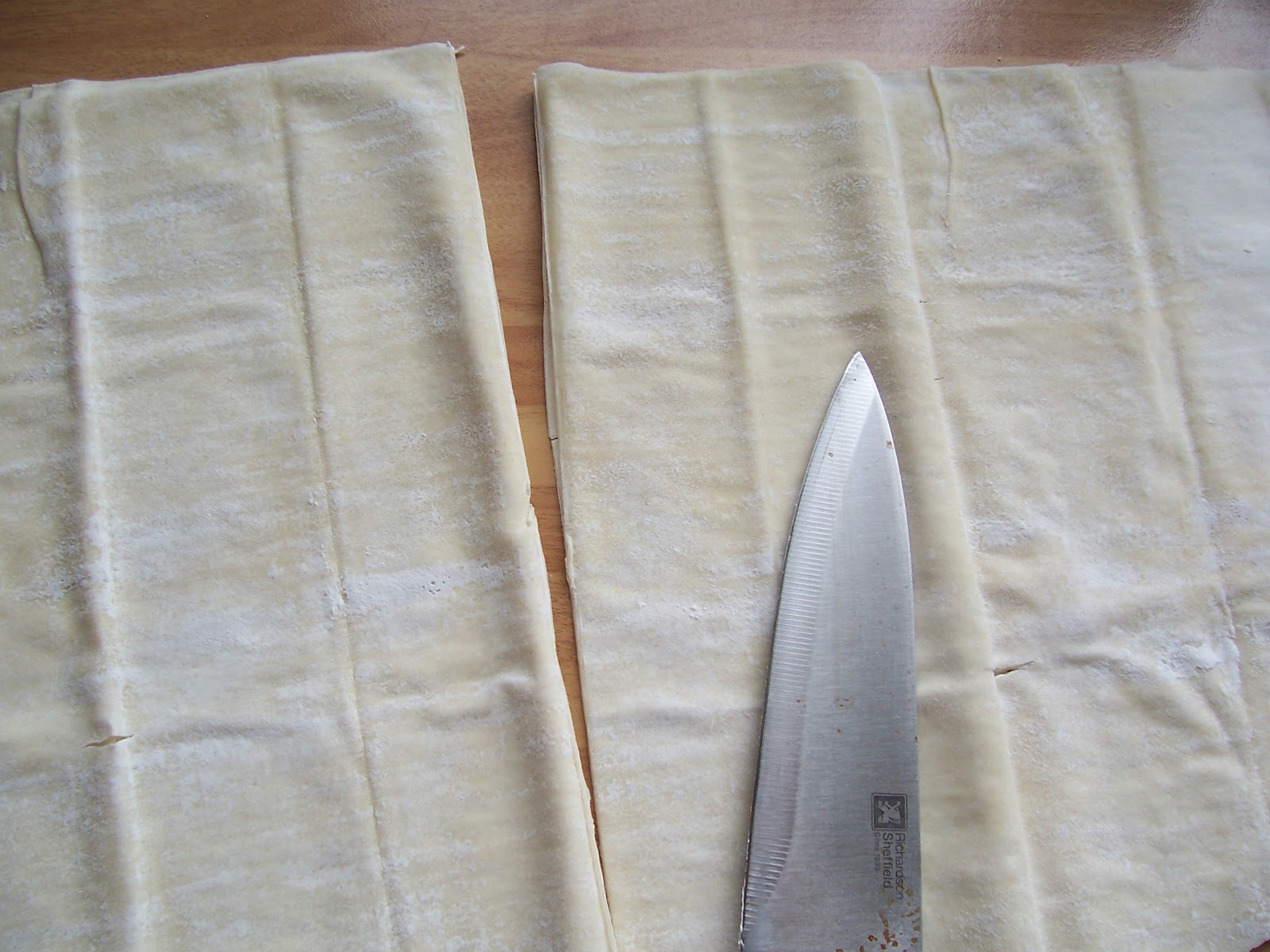 Unroll the filo pastry, keeping the sheets in a stack. Then, using a sharp knife, cut the pastry in half creating 12 squares.