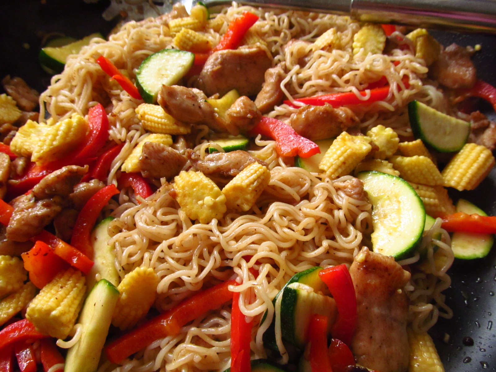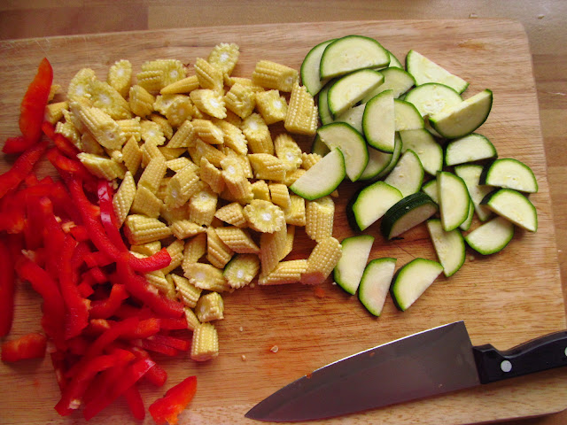 Add the peppers and sugarsnap peas, fry for 2-3 minutes, stirring all the time. Add the courgette and the mushrooms and cook for a further 2 minutes, if the vegetables are burning add 2-3 tbsp of water to the wok.