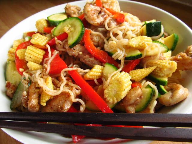 There are times when I feel very lazy, dithering between ordering take out or cooking! The very thought of ordering a Chinese take-out is extremely tempting, however I am of an age when lifting the phone will have consequences, namely on the weighing scales!! I wonder how in my twenties I got away with practically living on take-outs and how it didn't really effect my weight...well those days are well and truly over! Now the mere thought of a Chinese take-out has me regretting it....so here is a compromise. This tastes much better that take-out, full of vegetables and is quick to make...what's not to like? Use whatever, noodles or stir-fry vegetables you have, sit back and enjoy!