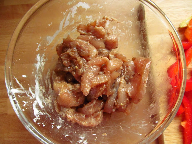 Uncover the marinaded chicken and mix in a heaped teaspoon of cornflour, this will thicken the sauce but also protect the chicken keeping it moist and tender while cooking. Heat a large frying pan or wok until it is smoking hot, add 1 tbsp of oil.