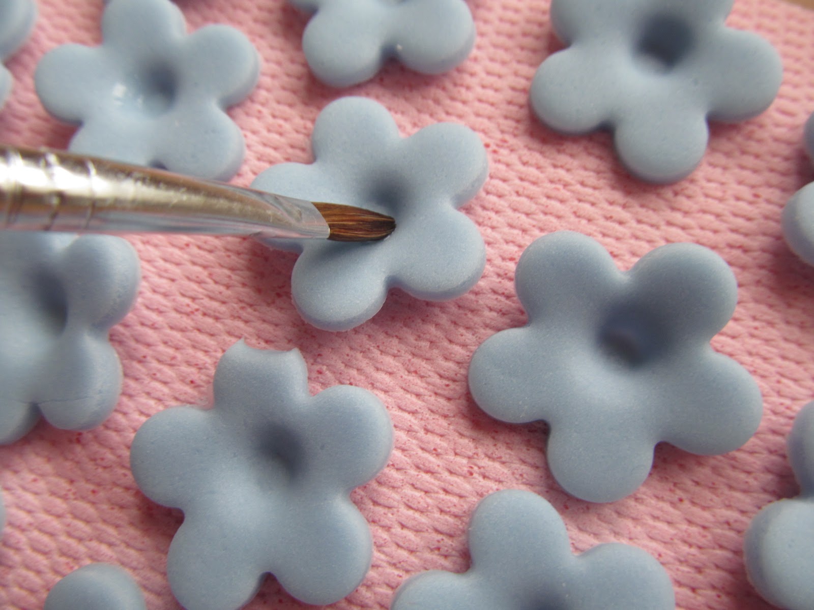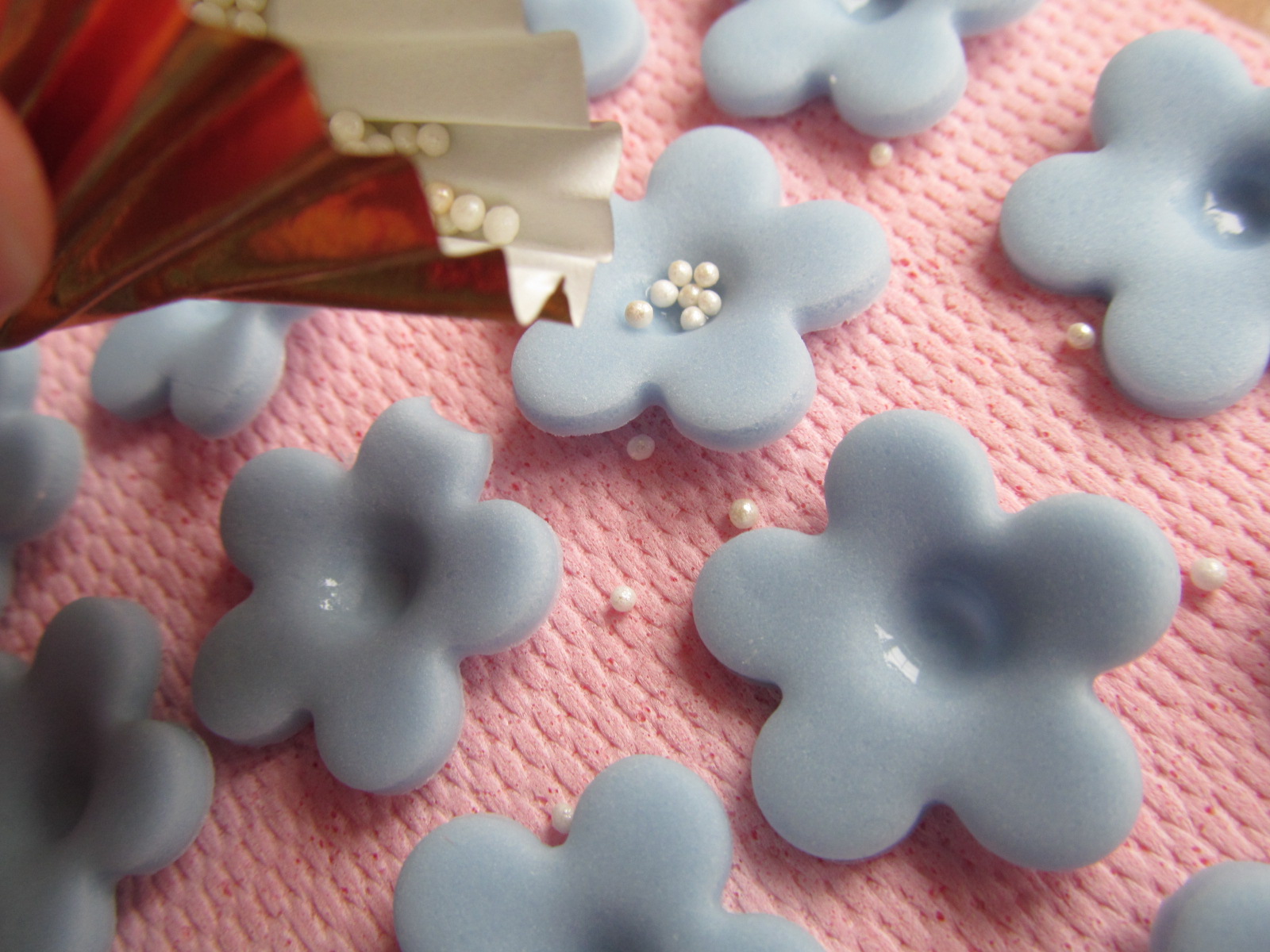 Brush the center of the plunger flowers with some boiled and cooled water, add the sprinkles and leave to harden.