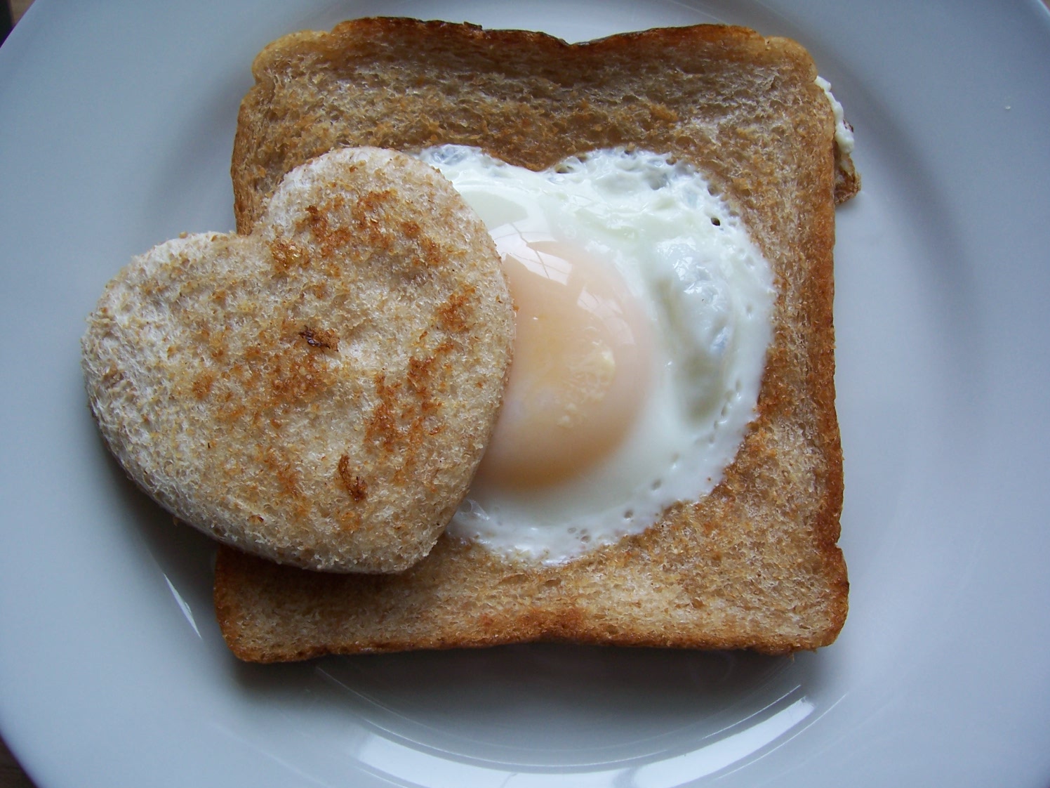 Using a scone cutter or any shape you choose, cut a circle out of the middle of the bread and fry until brown on the pan. Once nicely browned on one side, flip over and crack an egg into the hole.