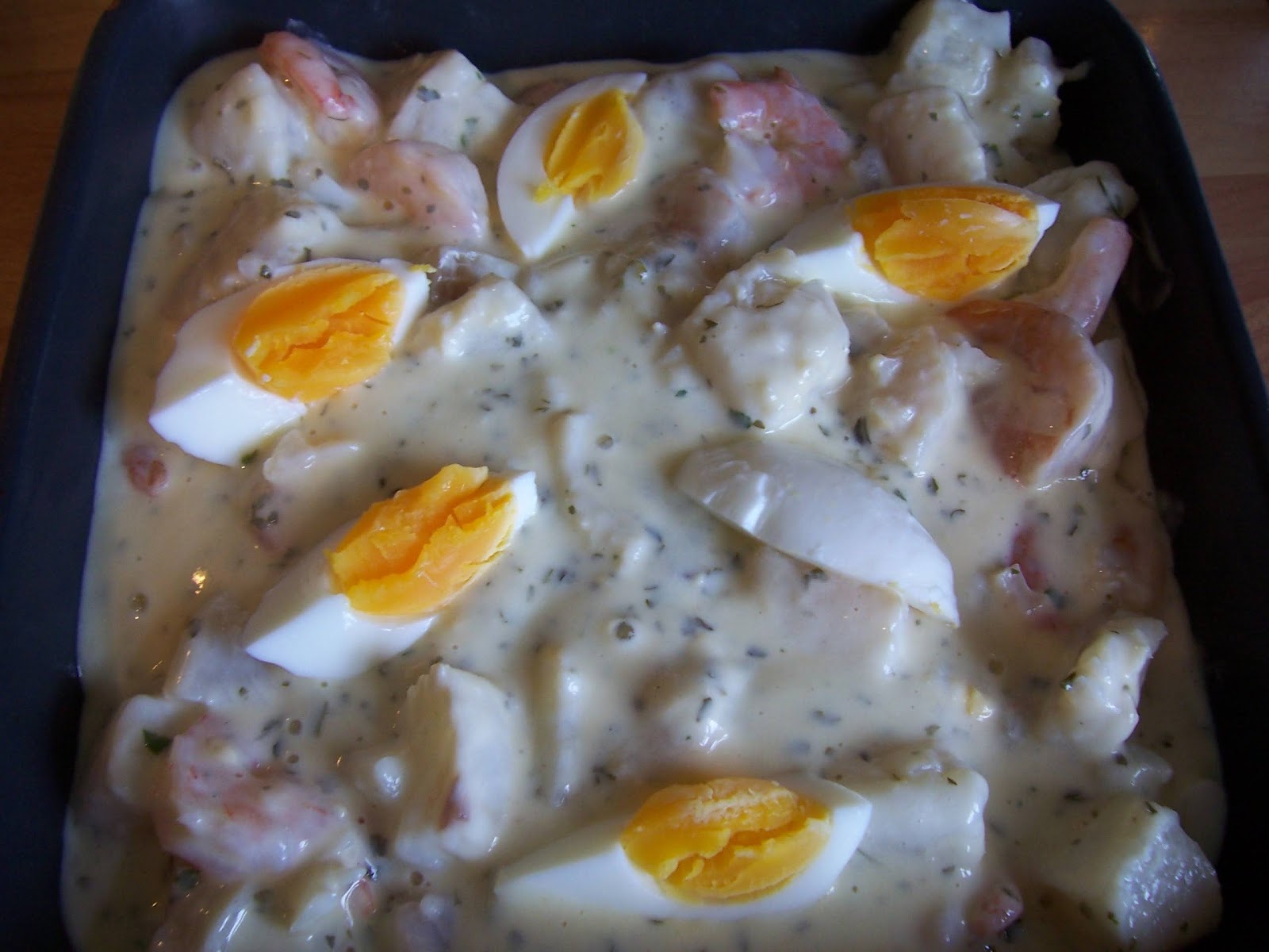 Cook for 5-6 minutes, remove from the heat. Place half of the quartered hard boiled eggs into a 22cm x 22cm ovenproof deep dish, pour over the fish mixture and top with the remaining eggs.