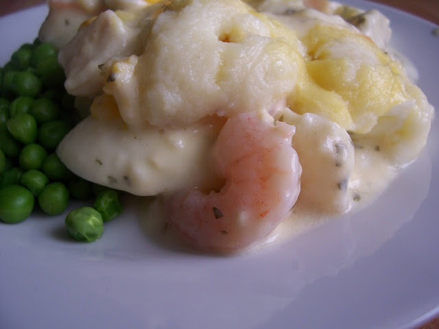 This homemade pie uses a really quick all-in-one white wine sauce and shop bought frozen mashed potatoes! I'm all for home made dinners but I am also practical and if time is against you then this "cheats" luxury fish pie should meet all your requirements. I think it is practical to regularly buy frozen mash for this pie or any potato topped pie, because I think that you've the done enough hard work making the filling. I regularly stock my freezer with cooked chicken strips, frozen mash, tortilla wraps and naan bread for evenings when a really quick meal is needed. My personal favourite quick meals are Chicken Fajita Wraps or Speedy Naan Pizza, these are quicker than ordering out or the frozen alternative.