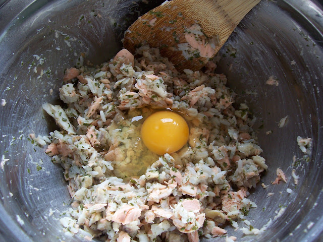 Meanwhile melt the butter in a small frying pan and cook the onion and mushrooms for 3 minutes, add to a large bowl, along with the cooked rice, parsley and breadcrumbs. Drain the cooked fish and allow to cool before handling, then add to the bowl with the seasoning, lemon juice and an half of the egg.