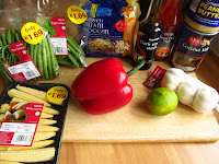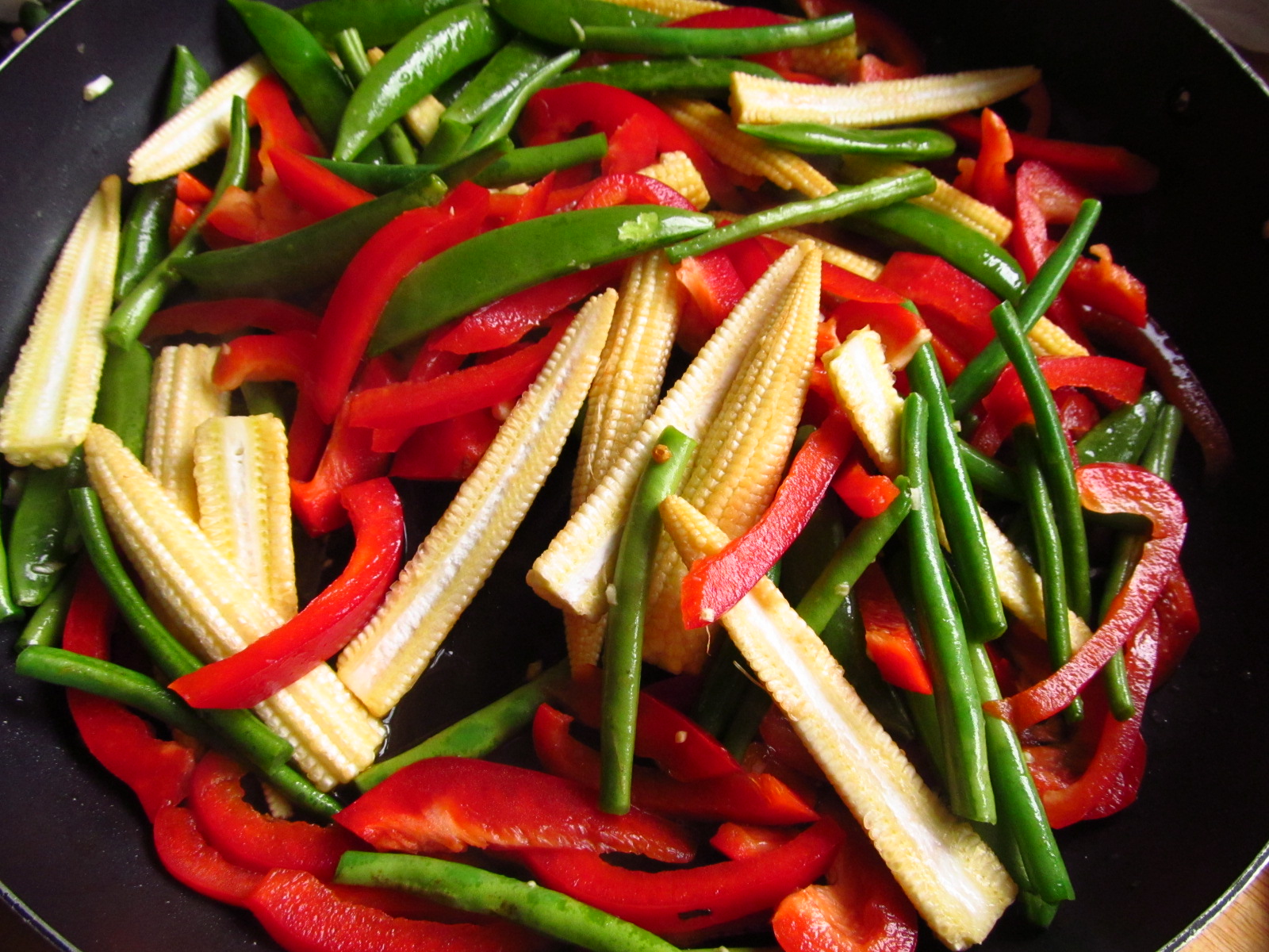 Add the oil and swirl it around the edges, then tip in the baby corn, green beans, sugar snap peas, red pepper and garlic and stir fry for 3-4 minutes, until the vegetables are tender, sprinkle over 1 tablespoon of water if the mixture is getting too dry.