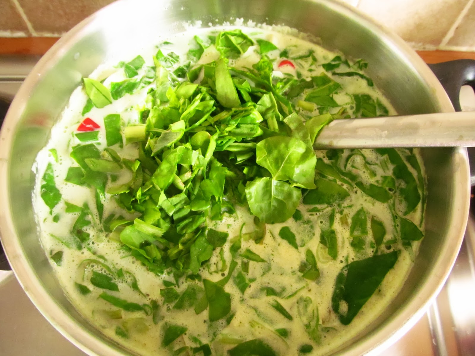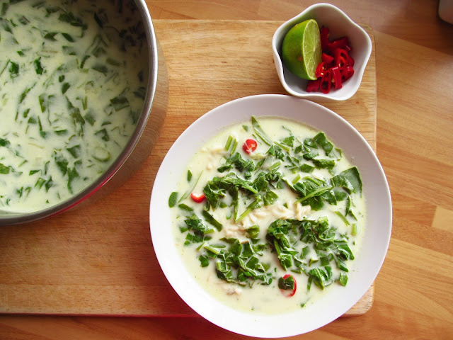 Serve with a wedge of fresh lime and sliced chillies for seasoning. This is best eaten on the day it is cooked as the spinach tends to discolour.