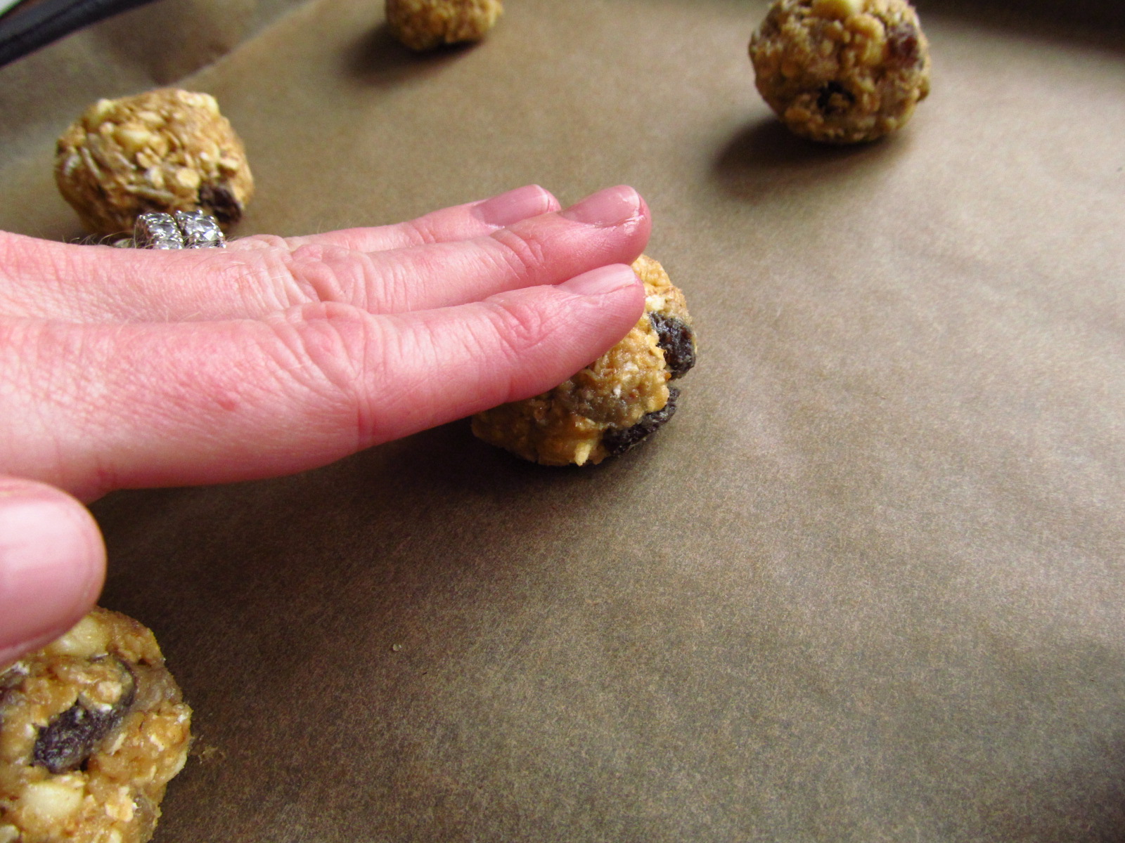 Shape into walnut-sized balls and flatten slightly by pressing in the centre with wet fingers. Allow about 5cm between each cookie as they will spread while baking.