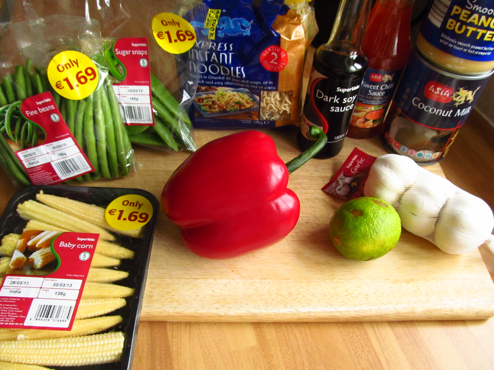 Add the coconut milk, peanut butter, soy sauce, chilli sauce and sugar, then squeeze in the lime juice. Stir fry for another 2-3 minutes, until all of the ingredients are piping hot and the sauce has reduced a little.