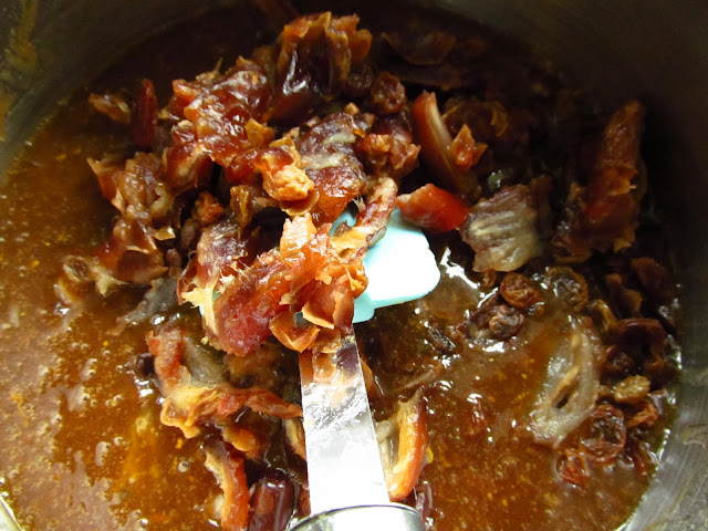 Drain the fruit and chop the dates finely. Add to the saucepan with the apples and mix well.
