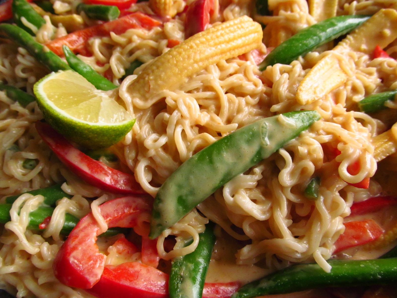 Drain the noodles and fold into the satay vegetables until evenly combined (I like to run a knife through the noodles a few times to cut them up, it makes it easier stir them through the vegetables and to serve them). Season to taste.