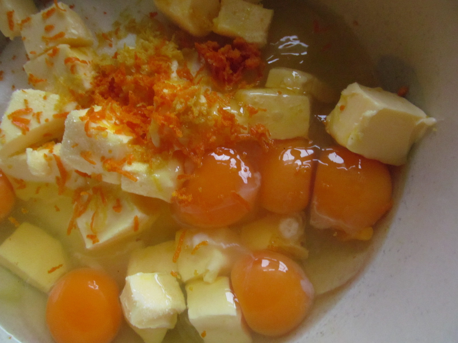 Add the sugar, butter and eggs.