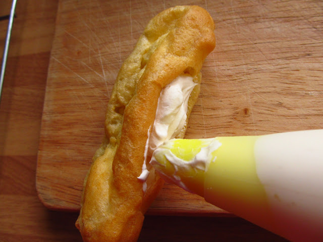 Place the pastry into a piping bag and pipe 5cm lengths and bake for 14-16 mins or until golden brown (don't be tempted to peep into the oven while they are baking or you'll have very flat eclairs!!).