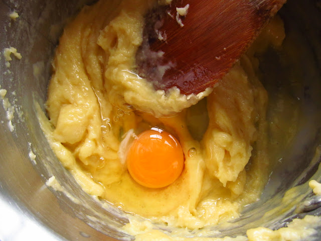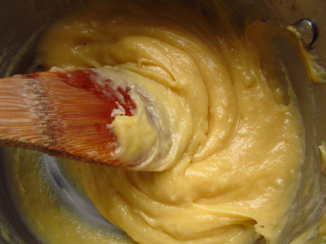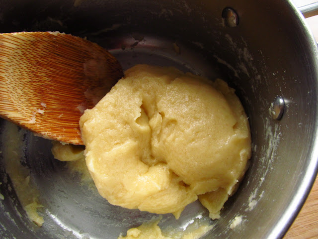 Remove from the heat and using a wooden spoon beat in all the flour at once. When the mixture comes away from the sides of the pan, allow to cool slightly.
