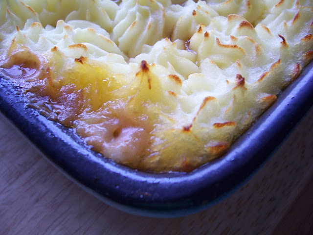 Mash the potatoes, add the salt, butter and a splash of milk to the potatoes. Add more milk until the potatoes are a soft dropping consistency. Fill the piping bag with a star nozzle and pipe rosettes on top of the lamb, just big enough so that the slightly touch. Now on plenty of occasions I have burnt off my finger tips doing this so I recommend thick rubber gloves!! To making filling any piping bag easier, place the bag, nozzle down into a large glass and fill. You don't have to be particularly neat doing this, just cover the lamb below.
