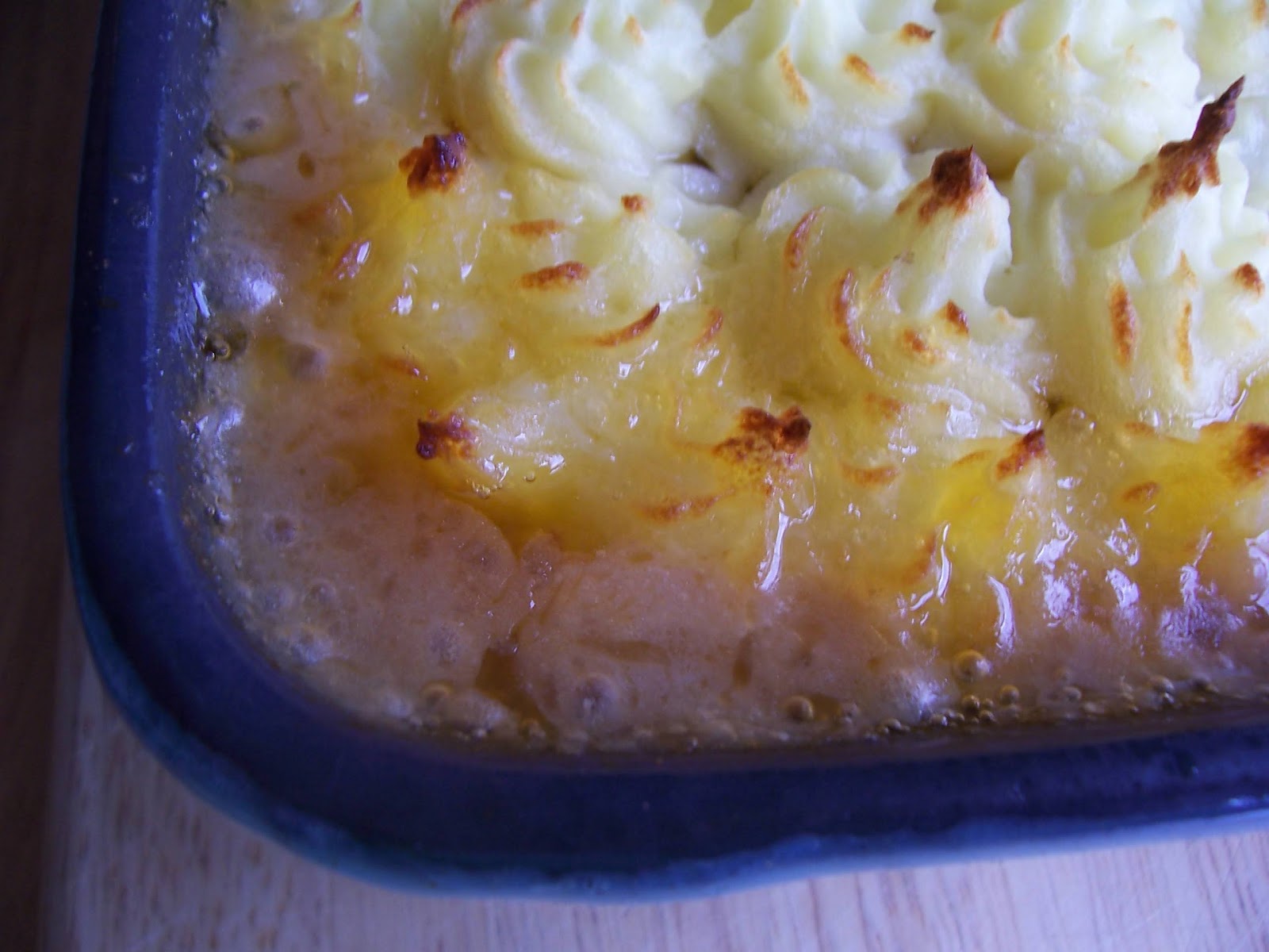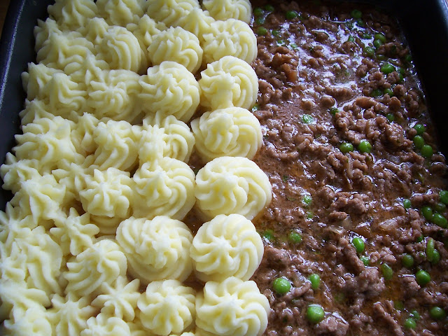 Place the potatoes in to a large saucepan of cold water,bring to the boil, reduce the heat and simmer for 15-20 minutes until tender when pierced with a fork. Drain and set aside. Melt the butter in a large frying pan, fry the onion and garlic over a medium heat until golden, don't burn the garlic as it will become bitter. Sprinkle the flour into the pan, stir to soak up all the juices, I add the flour now because it always goes lumpy if I added it after this stage. Cook for a further minute. Add the lamb and brown completely. Once browned on all sides, slowly add the beef stock, stirring all the time until the sauce thickens. Add the peas, ketchup and parsley, return to the boil and simmer gently for 3-4 minutes. Run your spoon across the pan and if it leaves a trail then the sauce is thick enough so your topping won't sink! Season. Pour the lamb into the greased dish.