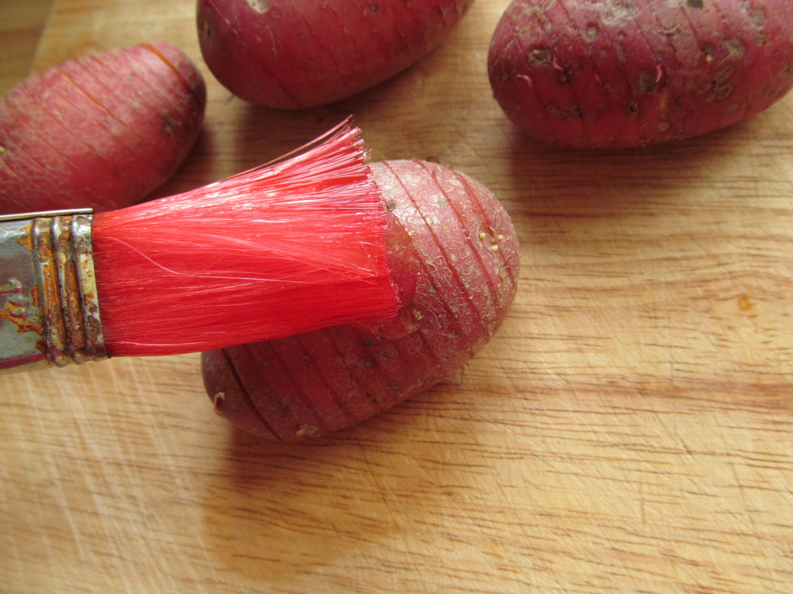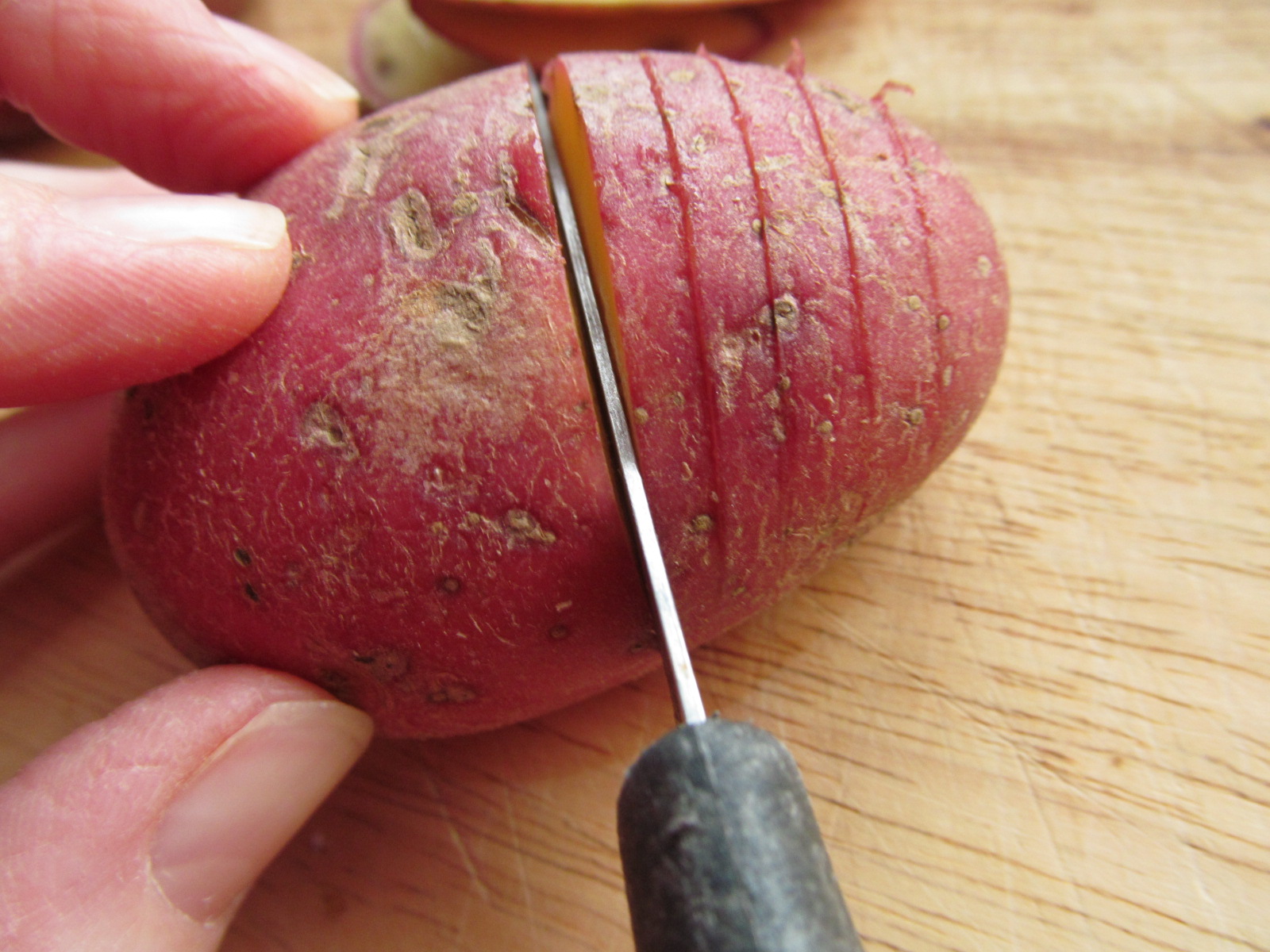 Lay the potato down on it's new bottom, carefully cut into the flesh but not the whole way through, making a incision every 3-4 mm across the whole potato, creating a fan effect. If you like you can place the handles of two wooden spoons either side of the potato which will guard against cutting right through the potato. Do this with all your potatoes, lay them on a large roasting sheet.