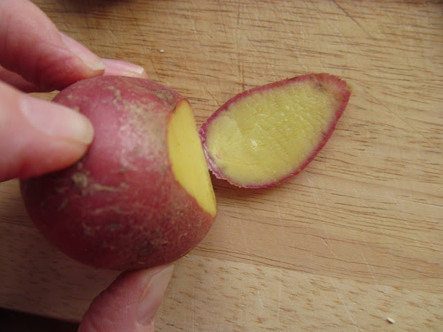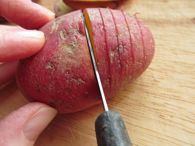 Preheat the oven to 220ºC/425ºF/Gas Mark 7. I don't bother peeling my potatoes but if you prefer to then go right ahead. I like to make the job as easy as I can so I usually slice a sliver of skin off the base of the potato, so it won't wobble while I'm cutting into the flesh. This is not necessary if the potato has a naturally flat base.