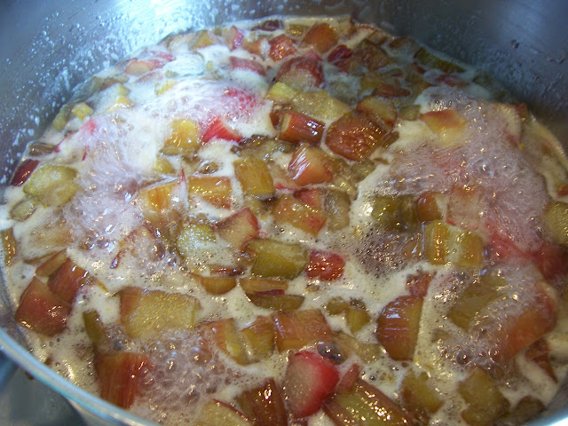 My parents visited recently and my father proudly presented me with his own organic, freshly cut rhubarb and a recipe for Rhubarb and Ginger jam from his beloved Real Irish Cookery by Mary Caherty. So after they left I got to work and this is the result, it is really quick to make and according to my father much better value than shop bought. I have a very large saucepan that my mother-in-law gave me when we married first (perhaps she thought that I was going to be feeding a very large family!) that has come in very handy for large jobs like this, so in this case the bigger the better, as jam gets very very hot and bubbly. This is just divine Brown Soda Bread and when I'm feeling really indulgent some Easy Homemade Butter!