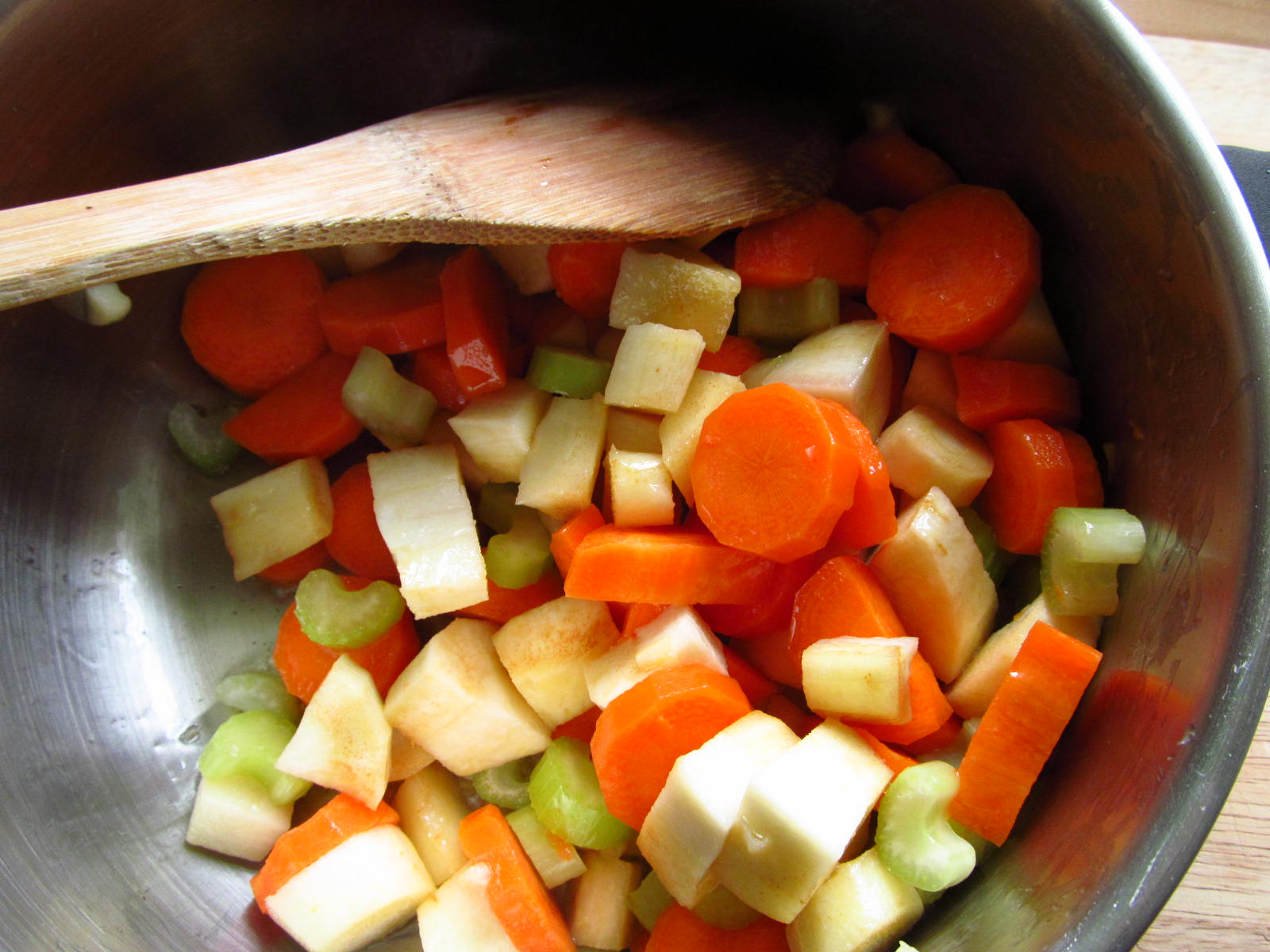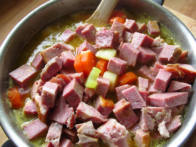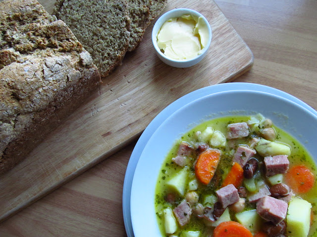 This is a really useful soup if you have leftover ham along with some winter vegetables lurking in the fridge. I used what vegetables I had, feel free to substitute as you please. This is only a guide, I think this would work just as well with onions or celeriac instead of the parsnip. I made this soup last year as a means of using up leftover baked ham and we enjoyed it so much that I took note of what I did this year so I could pass it on to you. I prepared the vegetables in advance (keeping the potatoes in water so they don't turn brown) so I could relax with my family, when the appointed time arrived I only needed to spend a short time cooking, before serving up bowls of winter warming goodness.