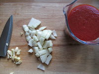This is a basic recipe for soup, and as it happens I'm having it for tea myself this evening. Now if you wish to spice it up then a pinch of crushed chillies will add the desired heat, alternatively a handful of small cooked pasta shapes or mixed beans added at the last minute turns this soup into a meal. This is a proper speedy soup if like me, you use prepacked chopped frozen garlic and frozen chopped onion (using both straight from the freezer!)