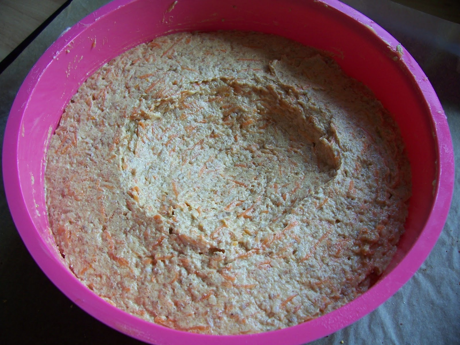 Stir in the grated carrots until everything is mixed together, then spoon into the cake tin.