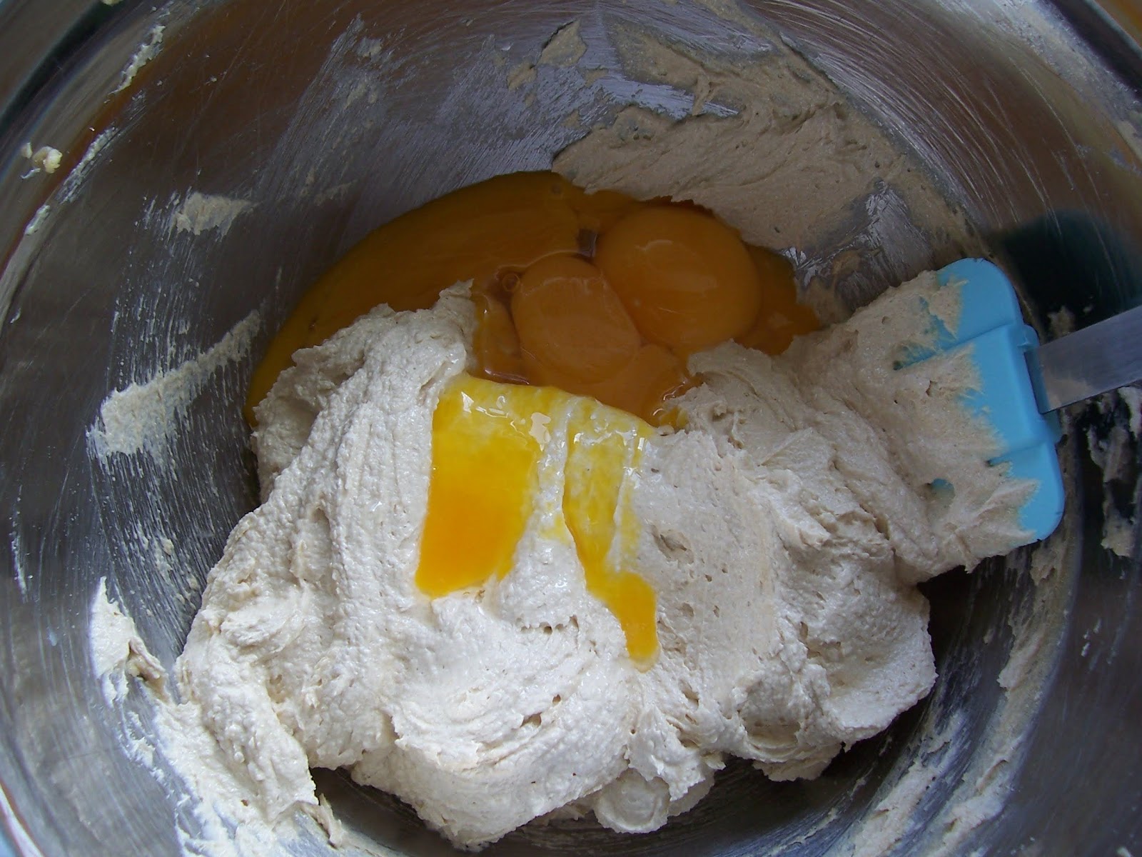 Separate the eggs and bead the egg yoke into the mixture, then stir in the orange juice and zest.